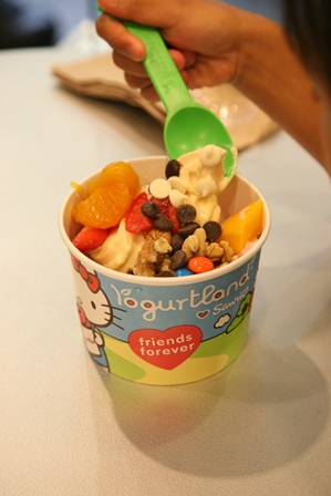まずはかわいらしい専用カップを持って好きなヨーグルトを入れます。 この時に事前に試食用の小さなカップを頼めばもらえるので、試食してから 選ぶといいです。2種類、3種類と好きなヨーグルトを選び終わると次へ・・・・GO~