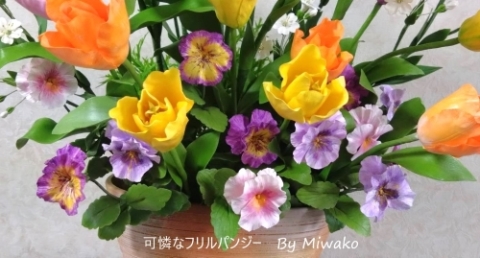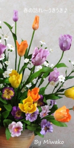 クレイアートNO.459・・・新作チューリップ&パンジーアレンジ日本全国のチューリップ畑の絶景がニュースを賑わしています 一度は行きたい名所がたくさんありますね! 教室ではクレイアートの作品が完成してみなさんに喜ばれています 沖縄では海洋博公園のチューリップが1月に一足お先に満開でした 卒業・入学シーズンの心ウキウキ 晴れやかなお花ですね 1教えたら5完成してくるMiwakoさん 生花を観察しながらどんどん進んでいつも大量に制作されて大作です 元気の出るビタミンカラーと優雅なパープルの組み合わせ フィラフラワーのサポナリアがマッチして素敵ですね 私の作りたいお花ナンバーワンのフリルパンジー♪ レシピを考案しながらのレクチャーで先を越されてしまいました 豪華なパンジーの完成に私も大感激! 庭のパンジーはそろそろ終わりですが 私は大急ぎで追いかけなくては?! にほんブログ村 ☆ |