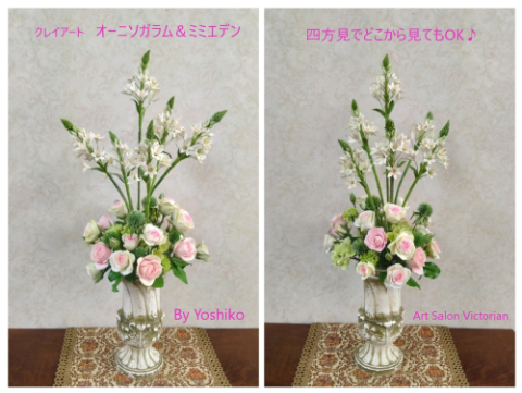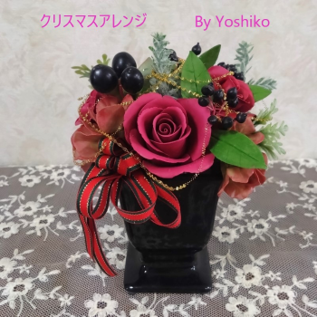年末年始の余力を残すべく 18日で今年のレッスンを修了しました 姑の介護負担が多くなり私の時間が少なくなってきたこともあります 作品のアップが遅れていますが一気にお披露目します 優しい色合いがお好きなYoshikoさん ミミエデンとコスタリカを気に入ってたくさん作成されました 第二弾はオーニソガラムとアレンジしました 高めスッキリのテーブルセンターピース オーニソガラム・シルソイデス 薔薇コスタリカとミミエデン あじさい・ビバーナム・ほか 高さの違うアイアン花器ペアで 赤とピンク(ふち赤)薔薇メインに 秋色あじさい・ユーカリテトラゴナ・ビバーナムティナス・ブラックパール・ほか