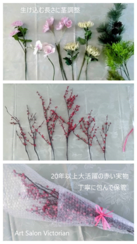 クレイ教室のウェルカムフラワーお正月装花を桜に入れ替え クレイのお花は生花と違ってお花が重たいのでアレンジもコツがあります 一番大事なことは重心を下にもってくること! 今回は大きな花器でしたので資材カタログを三冊丸めて入れました 隙間に大きな松から差し込み安定させます 次にフォーカルポイントのお花たちを足をその高さに調整して差し込むだけ 松とお花の間にウメモドキ&サンザシなどの赤い実を入れます それぞれの季節に登場した後は埃をはらいキッチリ包装して小さいものは上に掛け 大きなものは器にさして保存しています この赤い実はもう20~25年!毎年作りたしてこの3倍あります 倉庫になった和室はお花で満開 季節のお花をディスプレイするのは楽しい忙しさですね にほんブログ村 |