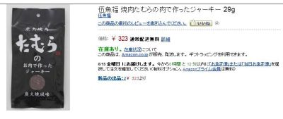 おっ!大好きなジャーキーがなぜか値下げ♪ しかも送料無料! 古いんだろうか?(笑) 定価は500円。。。 29gしか入ってないので和牛のステーキより高い! でも、たまらなく美味しい(^^) ええい!2つお買い上げだーっ。。 |