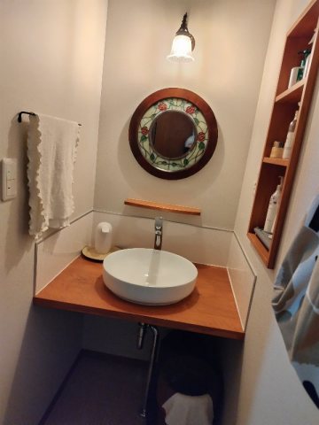 洗面台は25年前に作ったステンドグラスの鏡と小さなシンク