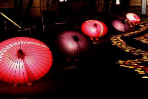「山鹿灯籠浪漫・百華百彩」と銘打った竹灯かりと番傘のオブジェの祭典です
