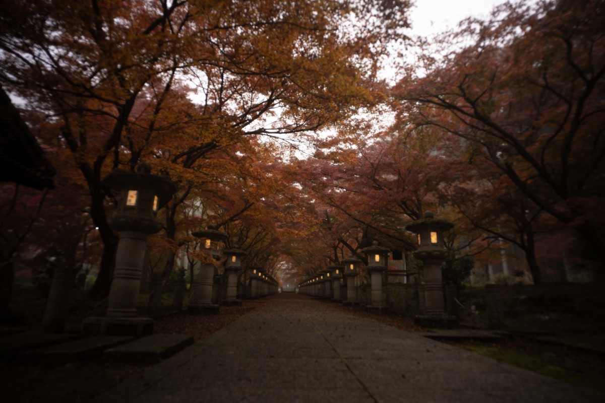 霧が出ており境内は暗かったのですが灯籠に灯りがあり良い雰囲気でした。