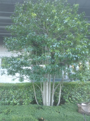 皇居お堀端辺りで見られる街路樹でしたらツバキ科タイワンツバキ属タイワンツバキ(ゴードニア・ラシアンサス)はいかがでしょうか。