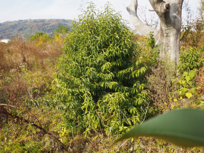 大山崎地区の桂川河川敷に生えていました。元の木が切られた切り株からのひこばえと思います。クロバイではないかと思いますが、いかがでしょうか。