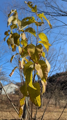 兵庫県南部の単独低山の中腹にある、樹高10mほどの落葉樹です。