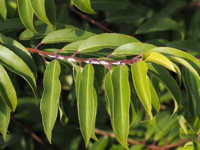 葉の様子です。上端部分は少し折れ曲がってしまいました。枝葉の写真(2枚目)で、木の枝に白く見えるのは、ハゴロモの仲間(おそらくチュウゴクアミガサハゴロモ)の産卵痕です。なぜかこの木にびっしりと産み付けられていました。よろしくお願いいたします。