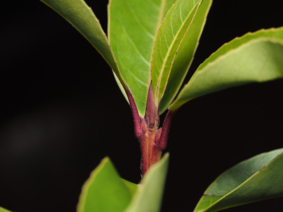 @対生葉序で全縁。A葉柄は短く緑色。B葉縁が葉裏側へ巻き込むことが多い。C葉に艶が無いことが多い。