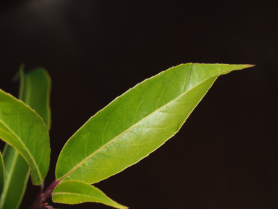 葉の様子です。葉は4〜5cmで、鋸歯はなく、葉表面にテカり感がありますが、葉裏は白っぽいものです