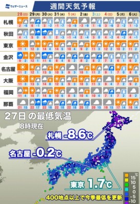 昨日27日(土)の朝は上空の強い寒気と放射冷却の影響で各地で厳しい寒さとなりました。