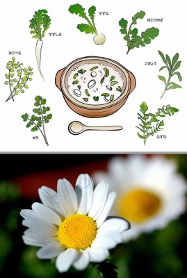 春の七草(セリ, ナズナ, ゴギョウ, ハコベラ, ホトケノザ, スズナ, スズシロ)を入れた七草粥を食べる風習で、