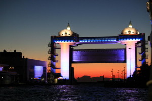 沼津港の水門です。 夜ライトアップして、観光地になります〜