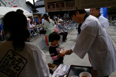 10月4日(土)、古川 醸室(かむろ)において釜神奉納祭および釜ちゃんブランド認定式が開催されました。同会場にて「みたらし米まる子ちゃん」を出品して来場者に振る舞いました。