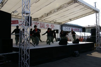 大仮装パフォーマンスコンテスト。写真中央は審査委員長大崎寿司組合会長さんです、出場者よりも目立ってしまいそうなパフォーマンスでした。