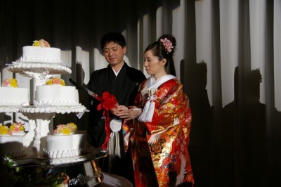 ウェディングケーキ入刀・・・とっても幸せそうですね。