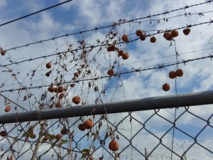 ザクロの木の下 踏切の近くで工事の為待機しているJRの職員に声をかけ写真をとる 実が大きく沢山なっている 誰も採らないのかしら? 職員さんは「ザクロですか、僕は何かなと考えて植物には詳しくないのでスモモかなと思いました」