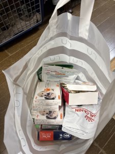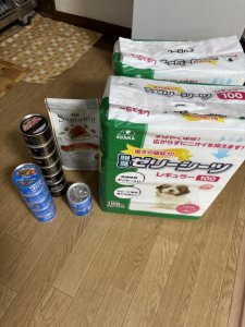 お手紙と共にワンちゃん用療養クッション、オムツ、キャリーバック、ちゅーる、ドックフードを頂きました。