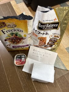 お手紙と共にトイレシート、ドックフードを頂きました。