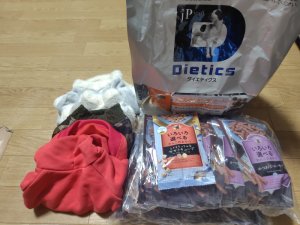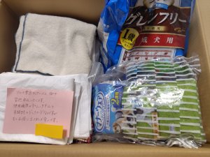 お手紙と共に犬用フード、マナーウェア、タオルなどをいただきました。