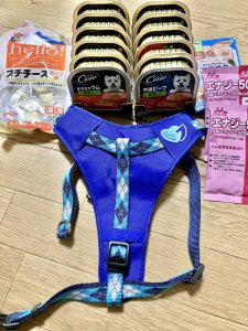 犬用ご飯、スープご飯、栄養補助食、おやつ、ハーネスを頂きました。