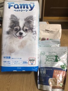 お手数と共に犬のフード、おやつ、シートを頂きました。