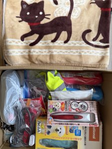 お手紙とともに、犬用フード、ペットシーツ、おむつ、フィラリア予防薬等を頂きました。