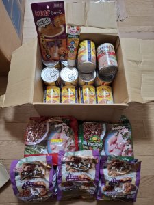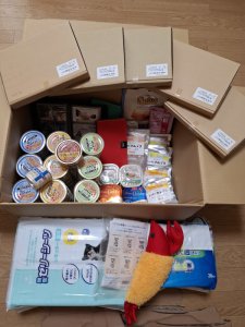 テレホンカード、犬用フード、トイレシート、オムツ、おもちゃを頂きました。