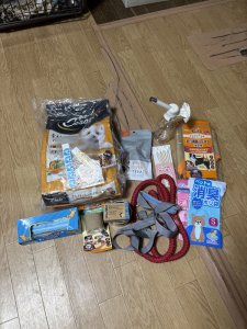 お手紙、犬用ご飯、ペットシート、マナーウェア、ネクスガード、ハーネスをいただきました。