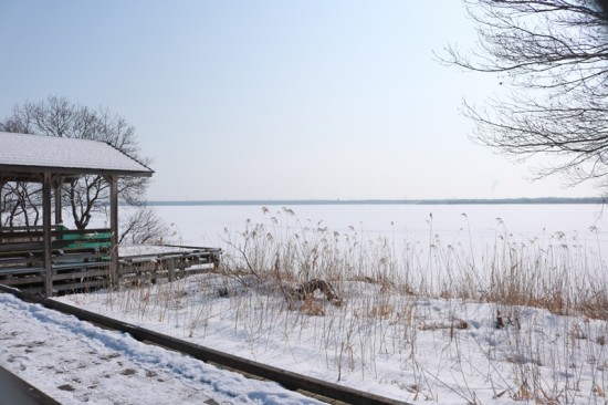このところの暖気で氷も融けたか、またはそれこそスケートリンクのようになってるかな?