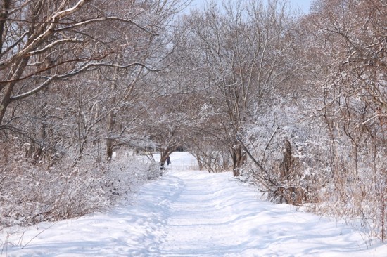昨日の湖面の足跡は、凍ったうえに雪が降り積もっているので、動物の足跡が残るのよ。
