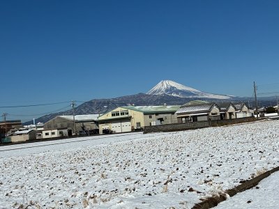 先日の雪が残っていて、翌日は田んぼも富士山も真っ白です。