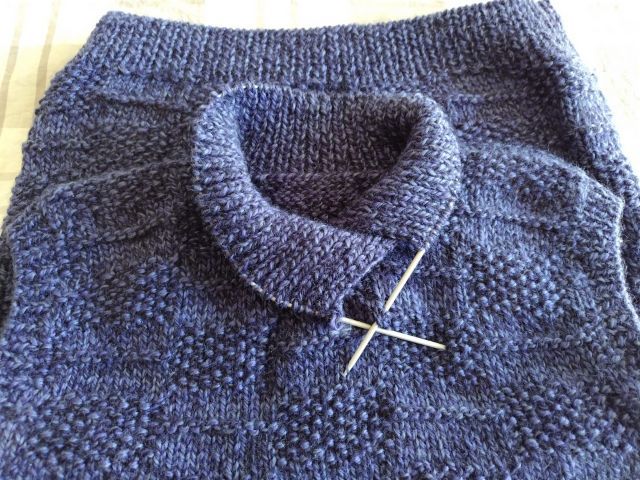 襟の一目ゴム編みの綴じをほどいたところです(輪棒に通しました)