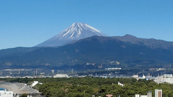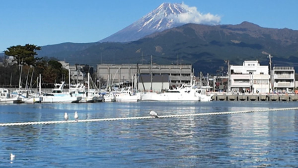 今日もお届けは昨日の続きです。沼津港で、その先には富士山が見えます。