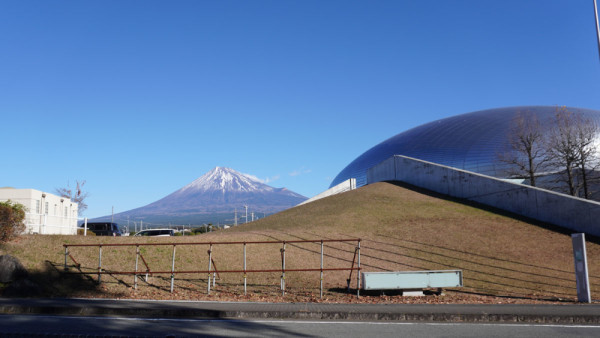 右側の建物は静岡県富士水泳場です。左側には、富士山が見えます。