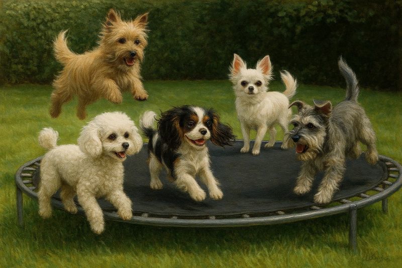 なのでチャットGPTに小型犬たちが芝生の上でトランポリンで遊んでいる絵を描いてもらいました。