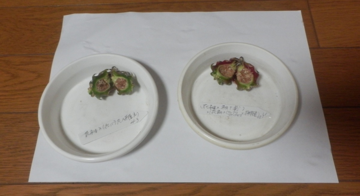 昨日花袖交配種についていた実の2果が色づいた様で収穫して切ってみましたが、両果とも果肉はなく種子の素みたいな白いものが5つほど入っているだけでした。