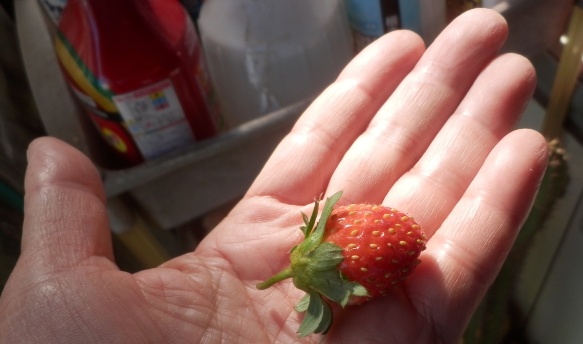 ちょっと前から季節外れのイチゴの花が咲いていましたが、2果色づいたものがありました。
