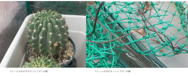 こちらは、フレームの中のサボテンのアゲハの蛹とフレームの外のネットのアゲハの蛹です。