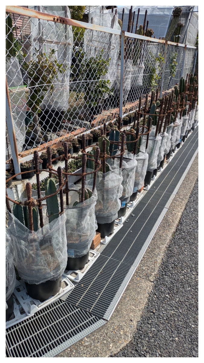 後ろの昨年のキリンウチワ台木実生置き接ぎは、大豪丸系交配種(=サブデヌーダツム2×(738王冠宝嶺殿×紫麗丸)16-5)です。
