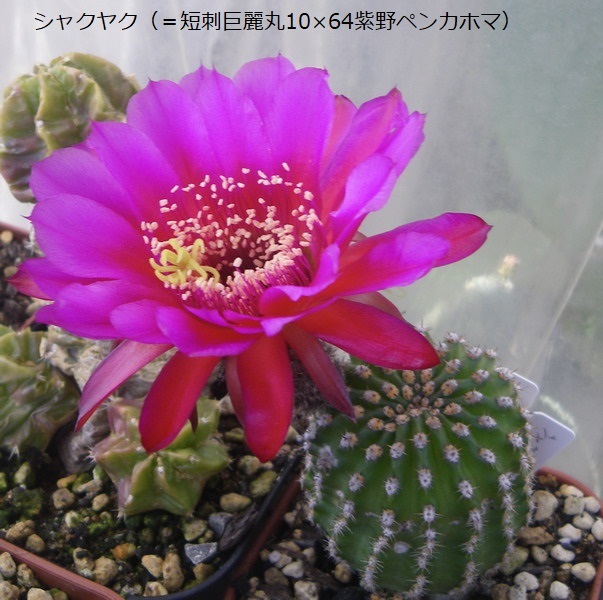 添付写真は シャクヤク(=短刺巨麗丸10×64紫野ペンカホマ) で、富さんの交配です。巨麗丸の短刺化に大豪丸系の交配が使われているようです。