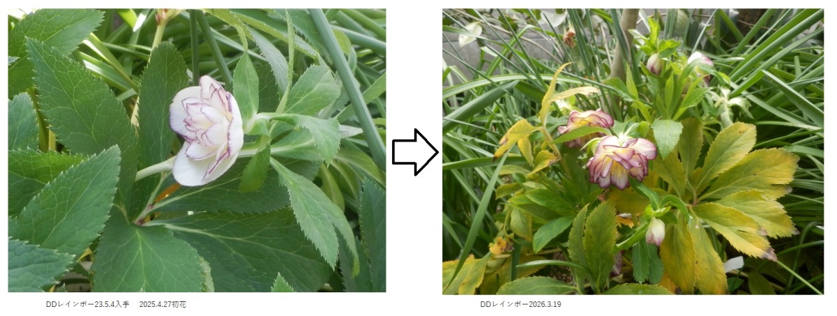 クリスマスローズのDDレインボーの昨年の初花と充実した今年の花の比較です。