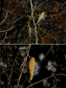 実の背中が割れて、タンポポの種の5倍はありそうな綿毛が、突風に乗って飛びます。