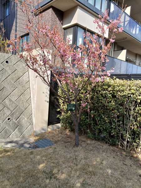 近くのマンションに植栽されていました。樹木札にはヤマザクラとありますが、葉が出ないうちに開花が進んでいます。色もかなり濃いピンクです。ヤマザラでよいのでしょうか。