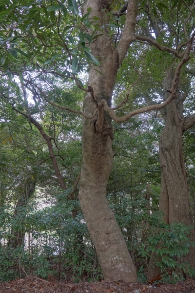 福岡県の神社境内で、幹がクネクネしながた立ち上がった高木が生えていました。