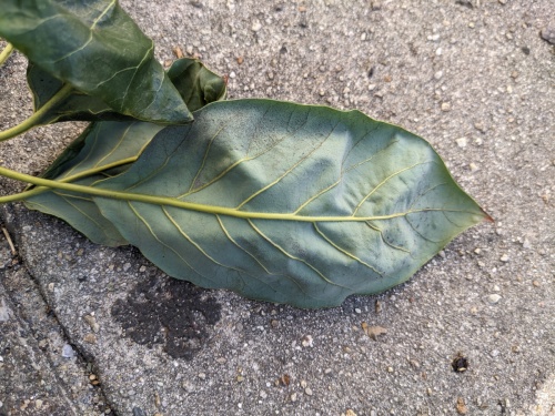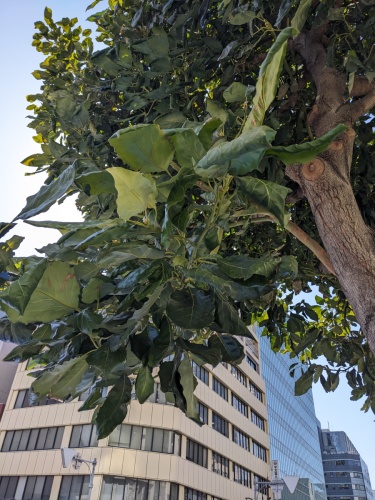 名古屋市中区の歩道に高さ5〜6mの常緑高木が生えていますが名前が分かりません。公園や街路に勝手に植えられている樹木は果樹が多いので、アボカドでしょうか?どなたか教えて下さい。