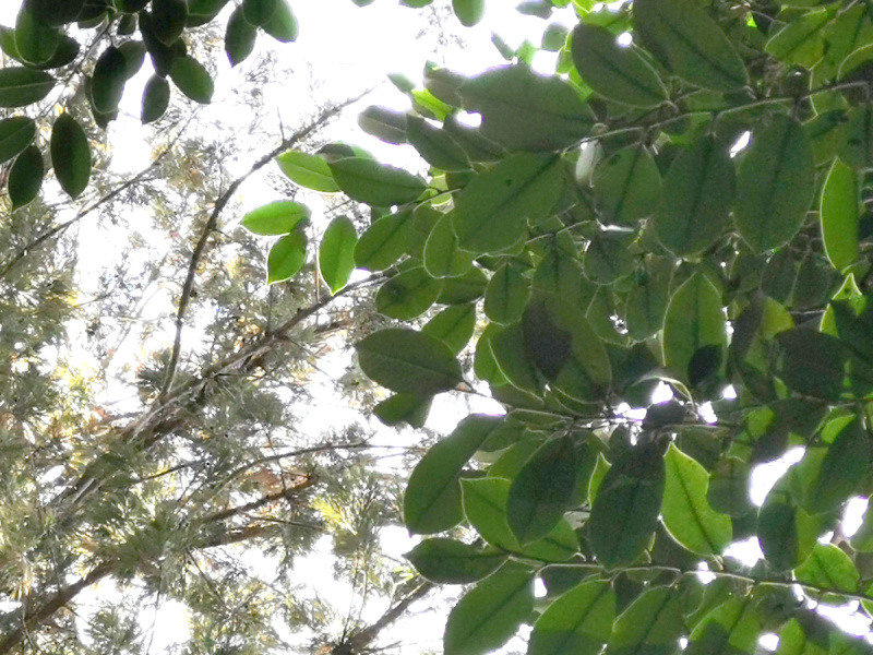 葉が全縁、互生と観えて細長く、巨木で神社、お寺にあるような木なのでオガタマノキと思いました