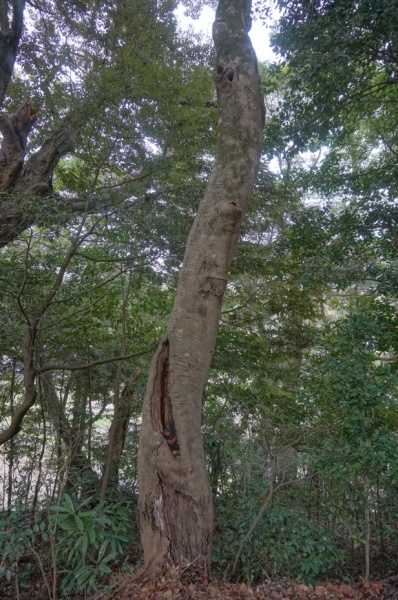 福岡県の神社境内で、幹がクネクネしながた立ち上がった高木が生えていました。