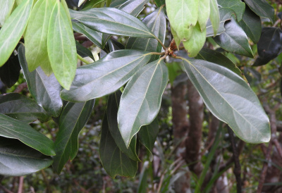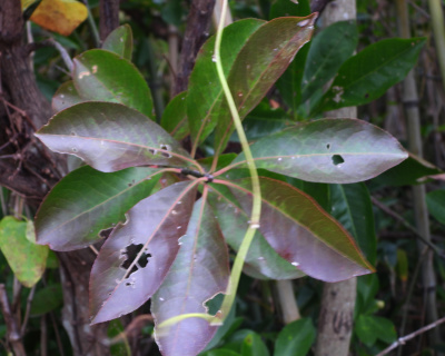 標準より葉が細いですが、葉柄は長くて赤みがあり、ちょっと垂れた感じ、たぶん常緑樹で、葉先よりに細かい鋸歯があります。