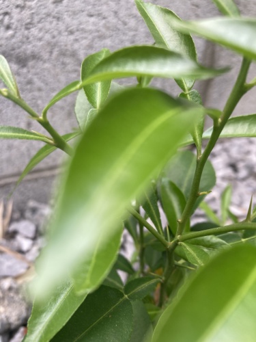 明るい色の主脈、やや目に見える細脈、シュッとした基部、裏に反り返る様子、枝先に集まりついている葉の様子がその理由です。